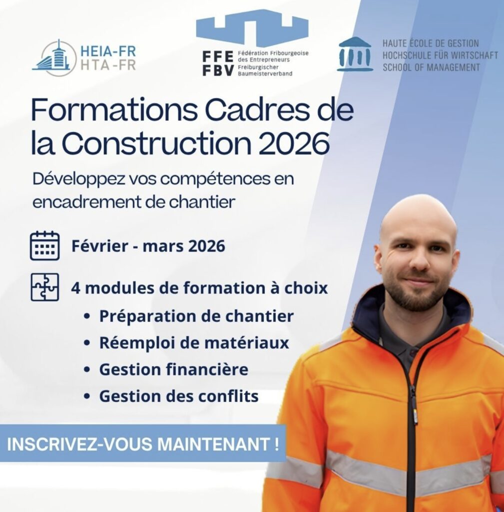 Face aux nouveaux défis, la FFE lance « Cadres de la construction 2026 », un programme inédit en partenariat avec la Haute école d’ingénierie et d’architecture de Fribourg (HEIA-FR) et la Haute école de gestion Fribourg (HEG-FR)